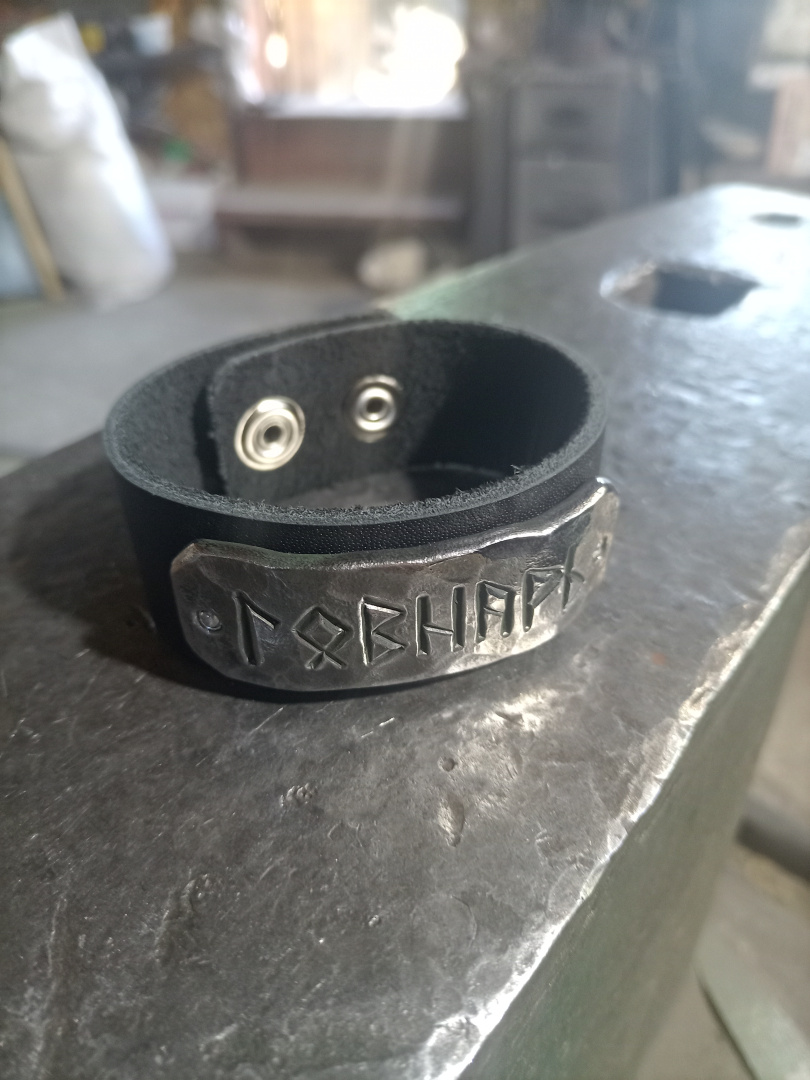 Браслет кожаный, с металлической бляхой. Начеканена уникальнейшая рунная комбинация моего собственного изобретения "я не такой как все", идеально подходит для людей желающих выделиться из толпы рядовых обывателей. Если у вас есть панкующий кореш - это выл бы лучший подарок для него.